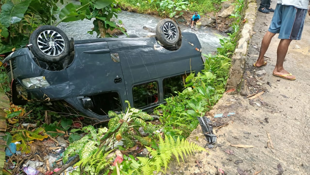 Ketika menuju turunan tajam mobil tersebut tidak bisa terkendalikan oleh sopir sehingga kendaraan oleng dan terguling ke sebelah kiri sungai.