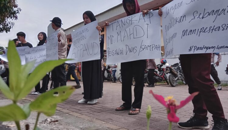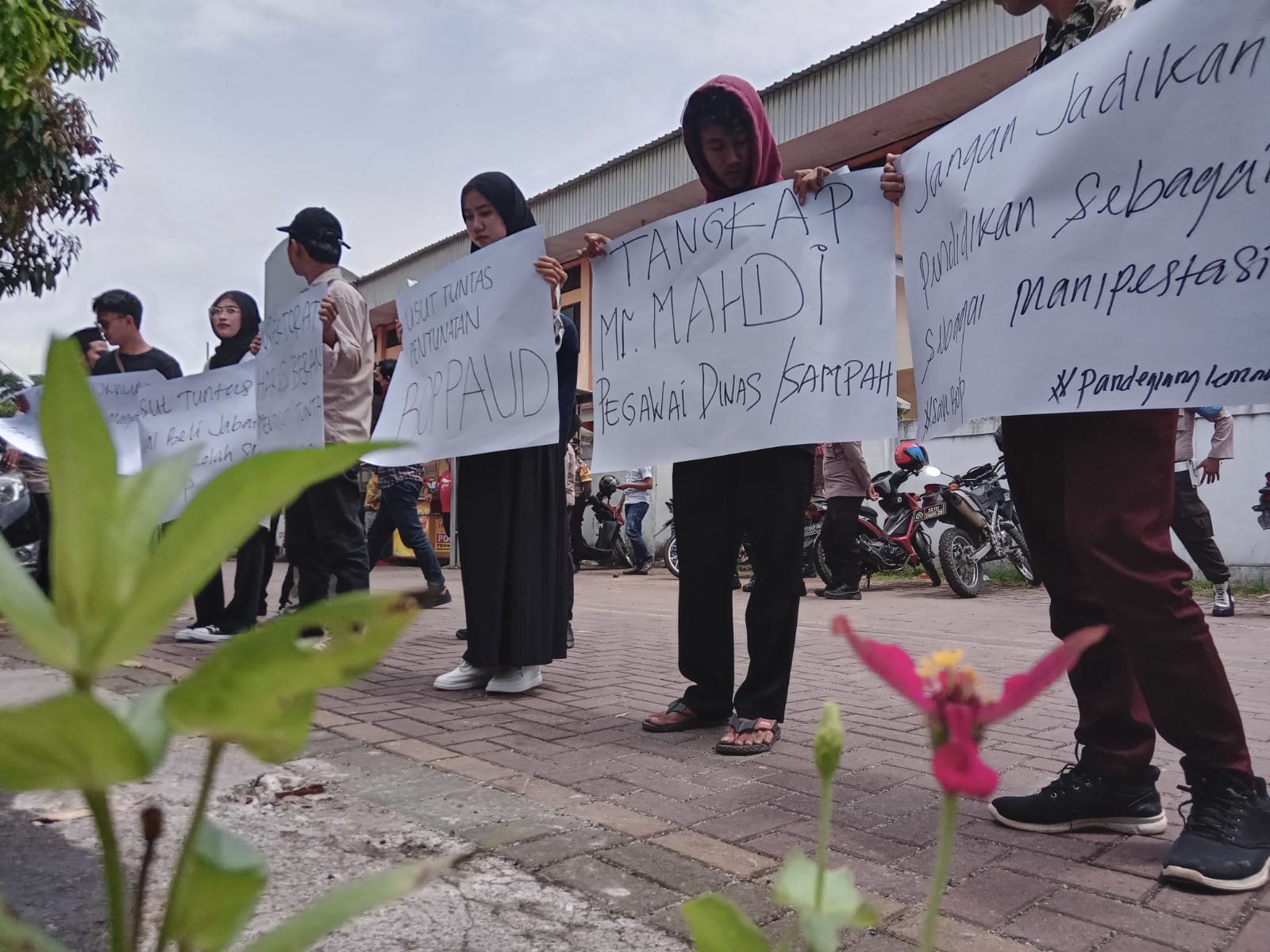 “Tangkap Mr Mahdi pegawai Dinas/Sampah” dalam atribut aksi P-4, di halaman Kantor Inspektorat Pandeglang.