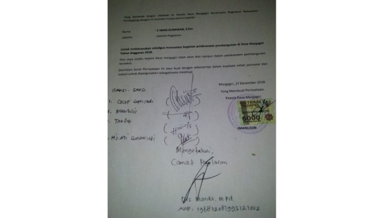 Dalam isi surat tersebut yang ditandatangani oleh Kepala Desa (Kades) Margagiri, yakni Imanudin dan turut ditandatangani oleh Camat Pagelaran, Marda sebagai pihak yang mengetahu serta sejumlah tandatangan saksi-saksi, bahwa “Yang bertandatangan di bawah ini adalah Kades Margagiri, dengan memberikan kuasa penuh kepada, Nama: E Iwan Gunawan S.sos jabatan Sekmat, untuk melaksanakan sekaligus memonitoring kegiatan pelaksanaan pembangunan di Desa Margagiri TA 2018. Dan saya selaku Kades Margagiri tidak akan ikut campur dalam pelaksanaan pembangunan tersebut”