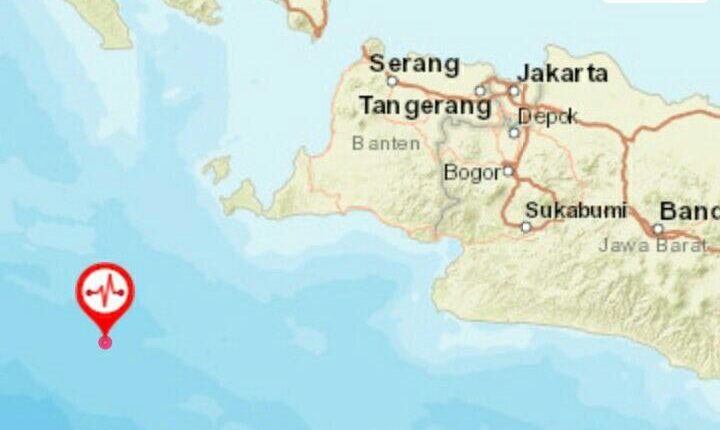 BMKG mencatat, gempa berpusat di 7.54 LS,104.58 BT, 147 km barat daya Sumur, Banten. Pusat gempa berada di kedalaman 10 km.