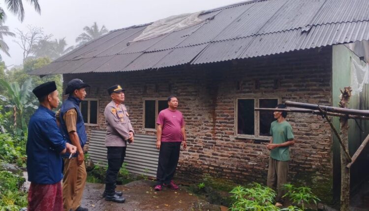 Kapolsek Pulosari, IPTU Yoffy Trinova, S.Pd., M.M., yang didampingi Kepala Desa Cilentung, serta Kampung Siaga Bencana (KSB) Pulosari, langsung meninjau rumah warga yang mengalami kerusakan akibat tertimpa ranting pohon petai.