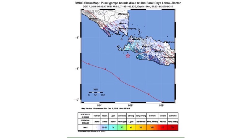 “#Gempa Mag:5.0, 07-Dec-18 06:43:17 WIB, Lok:7.19 LS,105.83 BT (83 km BaratDaya LEBAK-BANTEN), Kedalaman:19 Km, tidak berpotensi tsunami #BMKG,” tulis BMKG dalam akun Twitternya. (*/Gatot)