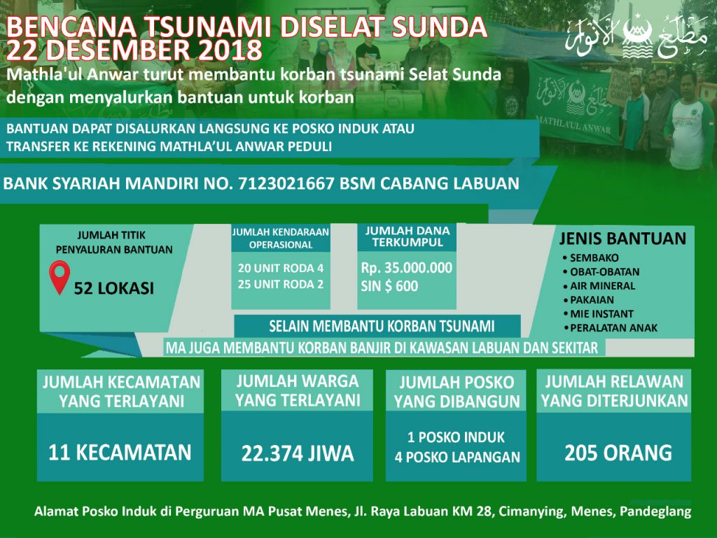 Sampai tanggal 28 Desember 2018, Posko Mathla’ul Anwar telah menyalurkan bantuan kepada 22.332 jiwa yang mengungsi di 72 lokasi pengungsian dari 11 kecamatan di Kabupaten Pandeglang. Posko akan terus beroperasi hingga selesainya masa tanggap darurat tanggal 9 Januari 2019;