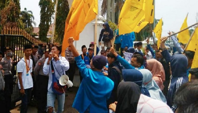 PANDEGLANG – Sejumlah mahasiswa yang tergabung dalam organisasi Pergerakan Mahasiswa Islam Indonesia (PMII) Cabang Pandeglang, menggelar aksi unjuk rasa didepan halaman pendopo Bupati Pandeglang, pada Kamis (18/10/2018).
