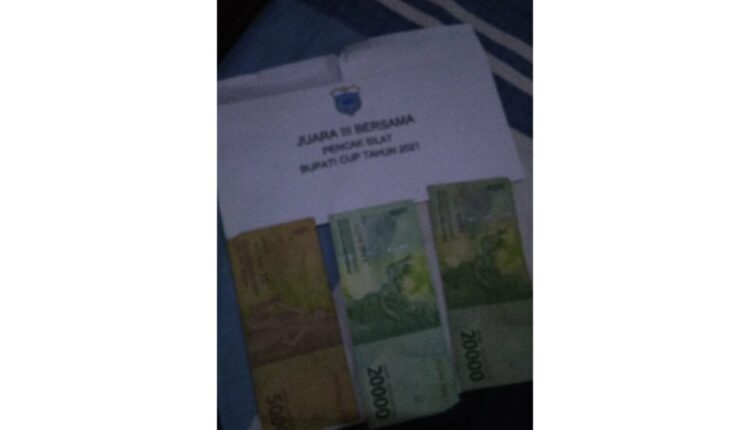 Foto hadiah berupa amplop untuk cabor pencak silat itu. Saat dilihat, Sabtu (18/12/2021) pukul 12.00 WIB, amplop bertuliskan ‘Juara III Bersama Pencak Silat Bupati Cup Tahun 2021’ ini telah dibuka dan menunjukan tiga lembar uang yang terdiri dari pecahan Rp20 ribu dua lembar dan Rp 5ribu. Jika ditotal, uang hadiah tersebut hanya Rp45 ribu.