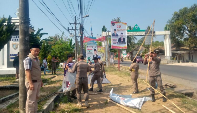 PANDEGLANG – Sejumlah alat peraga kampanye (APK) dicopot Satuan Polisi Pamong Praja (Satpol PP) bersama Badan Pengawas Pemilihan Umum (Bawaslu) Kabupaten Pandeglang, pada Selasa, (26/9/2023).