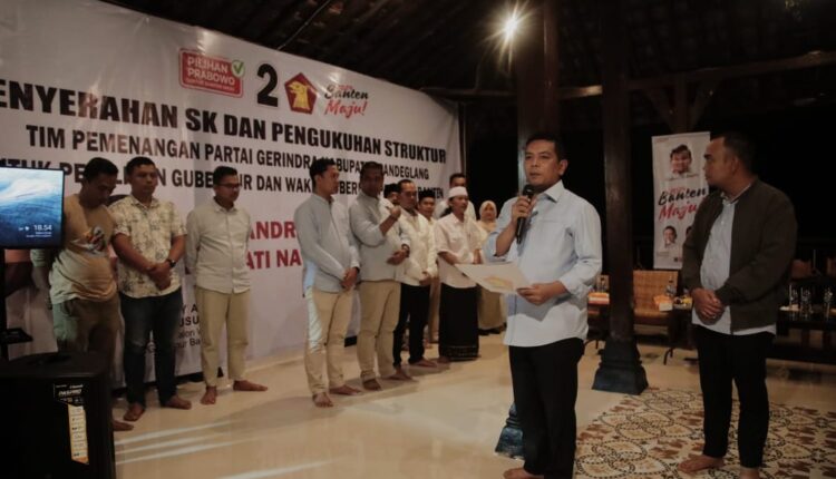 Penyerahan Surat Keputusan (SK) dan pengukuhan struktur tim pemenangan Partai Gerindra untuk Pilgub Banten 2024 ini sementara telah diberikan kepada dua Kabupaten, yakni Lebak dan Pandeglang.