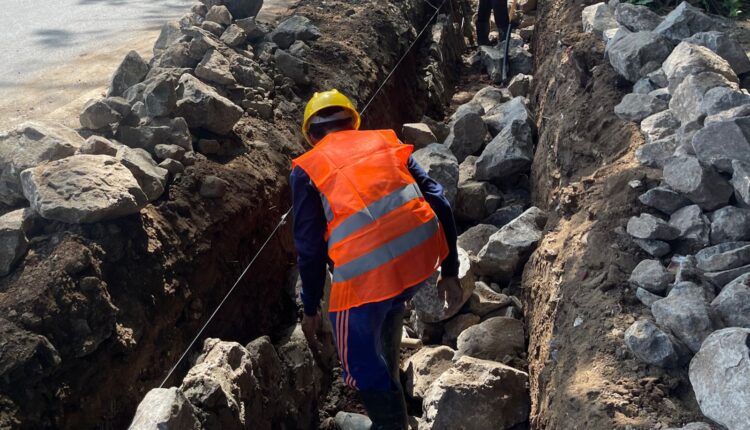 PANDEGLANG – Paska dikritik warga, sejumlah pekerja proyek drainase Jalan Nasional Pandeglang – Labuan mulai mengenakan K3, Jumat (09/06/2023).