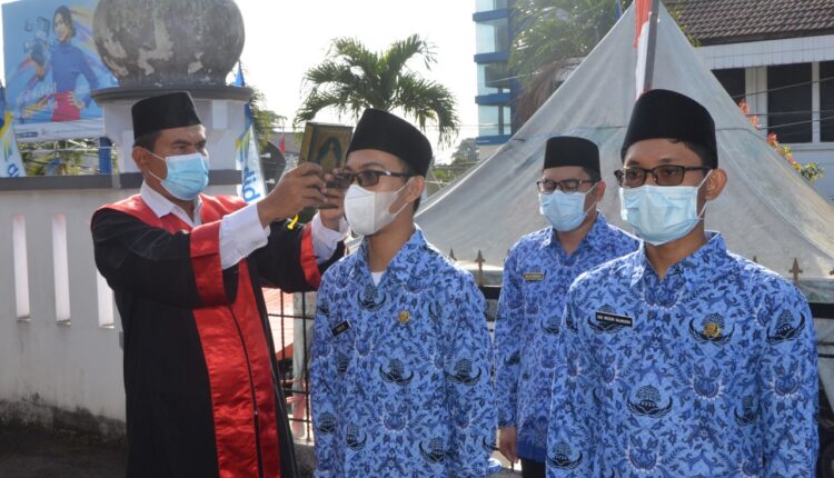 PANDEGLANG – Sebanyak 53 Calon Pegawai Negeri Sipil (CPNS) formasi tahun 2019 dilantik dan diambil sumpah untuk menjadi Pegawai Negeri Sipil (PNS) di lingkungan Pemerintah Kabupaten Pandeglang bertempat di Kantor Badan Kepegawaian dan Pengembangan Sumber Daya Manusia (BKPSDM) Kabupaten Pandeglang, Senin (11/4/2022).