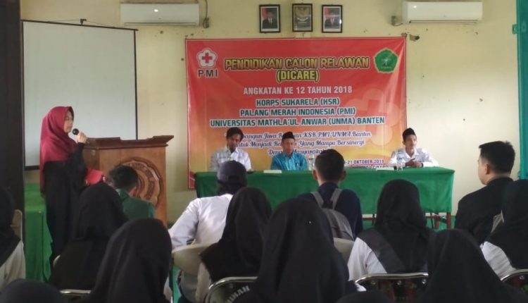 PANDEGLANG – Korp Sukarela (KSR) Palang Merah Indonesia (PMI) Universitas Mathla’ul Anwar (UNMA) Banten menggelar Pendidikan Calon Relawan (Dicare) angkatan ke-12. Acara ini dibuka secara resmi di Aula Gedung Fakultas Keguruan dan Pendidikan UNMA Banten, Jumat (19/10/2018).