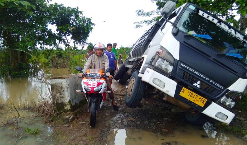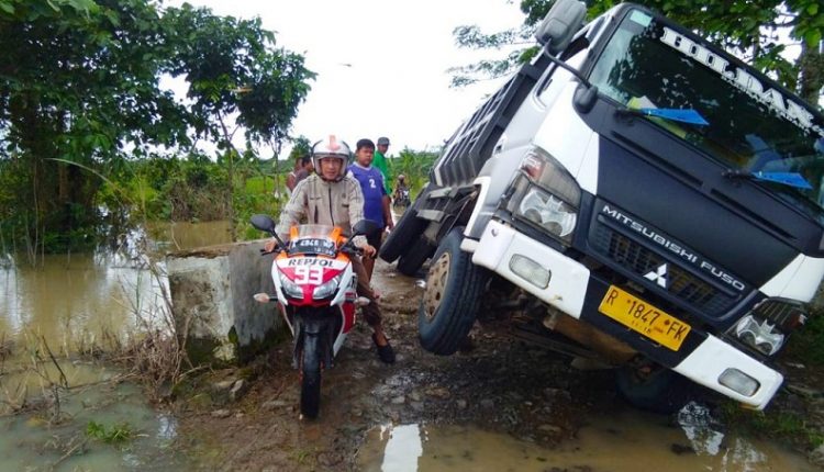 Truk Pengangkut Split Ambles di Jembatan Penghubung Desa Pasir Loa dan Bojong Manik