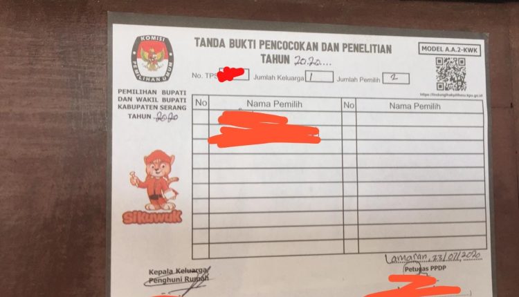 SERANG – Hari ke-21 pengawasan Coklit, sejumlah temuan diperoleh Bawaslu terhadap pelaksanaan yang dlakukan oleh Petugas Pemutakhiran Daftar Pemilih (PPDP) di lapangan. Salah satunya adalah ditemukannya stiker tanda bukti Coklit (Forumulir model A.A.2 KWK) yang tidak sesuai dengan spesifikasi, sebagaimana diatur dalam PKPU No.19 Tahun 2019 tentang Pemutakhiran Data dan Penyusunan Daftar Pemilih Pilkada.