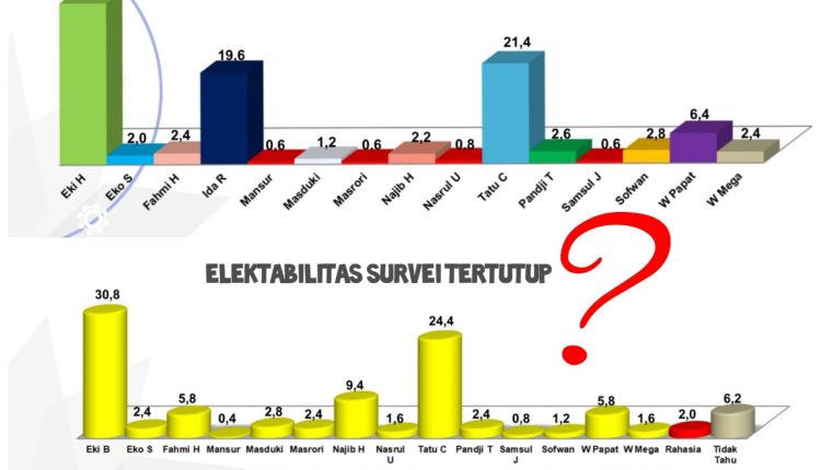Apalagi jika dibandingkan antara popularitas dengan hasil survei terbuka. “Pada popularitas atau yang kenal dan tahu nama Eki ini mencapai 34,4 persen. Tapi yang memilih pada survei terbuka mencapai 35,8 persen. Jadi ada pemilih yang disurvei, dia tidak kenal dan tidak tahu nama Eki, tapi menyebutkan nama Eki Baihaki, itu sangat aneh,” tandasnya.