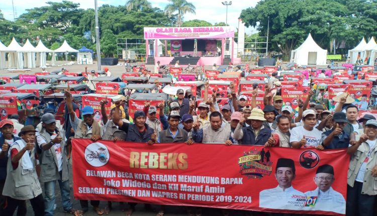 SERANG – Relawan Becak Kota Serang (Rebeks) gelar deklarasi siap dukung Jokowi-Ma’ruf. Hal tersebut dilaksanakan di Alun-alun Barat kota Serang.