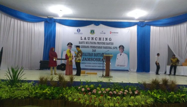 SERANG – Dinas Sosial Provinsi Banten menggelar launching kartu multiguna bagi masyarakat Kota Serang penerima Jamsosratu, Selasa (28/8/2018), bertempat di GOR Maulana Jusuf, Kota Serang.