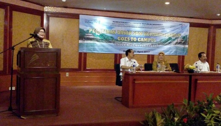 SERANG – Untuk membantu melakukan promosi destinasi wisata di Provinsi Banten, Kementerian Pariwisata Republik Indonesia dan Dinas Pariwisata dan Kebudayaan (Disparbud) Provinsi Banten, mengadakan pelatihan dasar sumber daya manusia kepariwisataan goes to campus di Le Dian Hotel, Jumat, (21/4/2017).