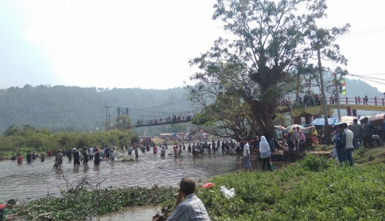 SERANG – Keramaian terlihat ketika ribuan masyarakat turun berjamaah ke sungai untuk menangkap ikan pada acara Ngagurah Dano di Desa Rancasanggal, Kecamatan Cinangka, Kabupaten Serang. Minggu, (28/7/2019).