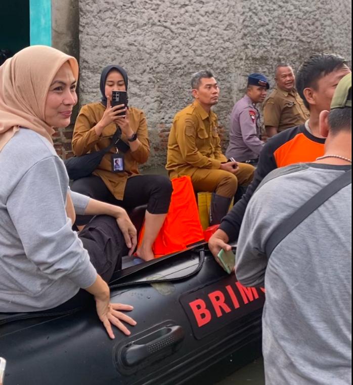 Tak berhenti di situ, Ratu Zakiyah kembali melanjutkan peninjauan ke titik-titik banjir lainnya menggunakan perahu karet.