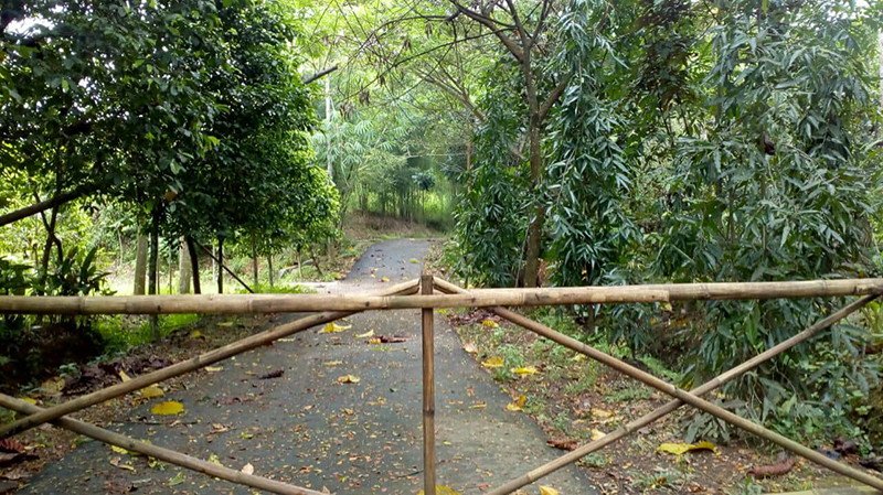 Blokade pintu masuk dibuat di jalan utama menuju hutan samping pos jaga, sementara gerbang masuk dibiarkan terbuka.