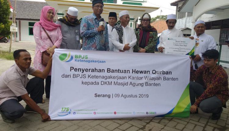 SERANG – Jelang perayaan Idul Adha dan sebagai upaya membangun kesadaran sosial serta tanggungjawab terhadap lingkungan, BPJS Ketenagakerjaan Kanwil Banten menyalurkan bantuan qurban satu ekor sapi ke DKM Mesjid Agung Banten Lama, Jumat (9/8/2019).