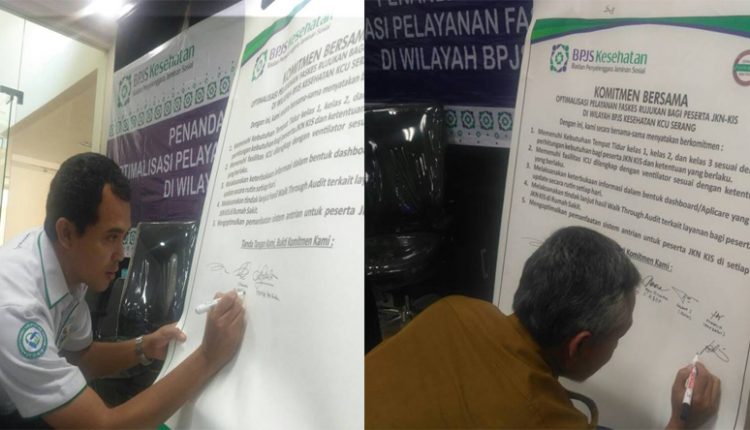 SERANG – Badan Penyelenggara Jaminan Sosial (BPJS) Kesehatan bersama dengan rumah sakit mitra di Provinsi Banten, melakukan penandatangan nota komitmen optimalisasi pelayanan fasilitas kesehatan (faskes) di wilayah KCU BPJS Kesehatan Serang, Senin (19/6/2017).