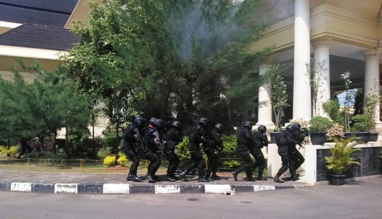 SERANG – Satuan Brimob Polda Banten, membuat simulasi penanganan teror di Kawasan Pemerintahan Provinsi Banten (KP3B), Rabu (26/7/2017).
