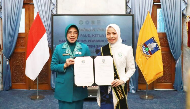 SERANG – Bunda Pendidikan Anak Usia Dini atau Bunda PAUD Provinsi Banten, Tinawati Andra Soni melantik Bupati Serang Ratu Rachmatuzakiyah sebagai Bunda PAUD Kabupaten Serang Periode 2025-2030 di Pendopo Bupati Serang pada Jum’at, (4/7/2025).