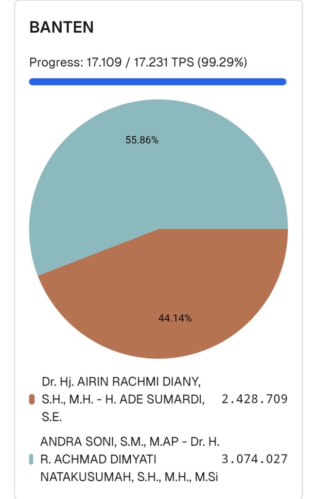 Calon gubernur dan wakil gubernur Banten, Andra Soni-Dimyati Natakusumah tercatat unggul sementara dari pasangan Airin Rachmi Diany-Ade Sumardi.