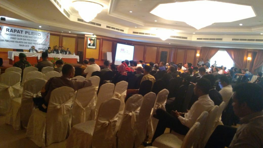 SERANG – Komisi Pemilihan Umum (KPU) Kota Serang menggelar rapat pleno penyerahan berita acara hasil penelitian syarat calon dan pencalonan dalam pemilihan Walikota dan Wakil Walikota Serang, Senin (12/2/2018) sekitar pukul 10.00 WIB, di hotel Le Dian, Kota Serang.