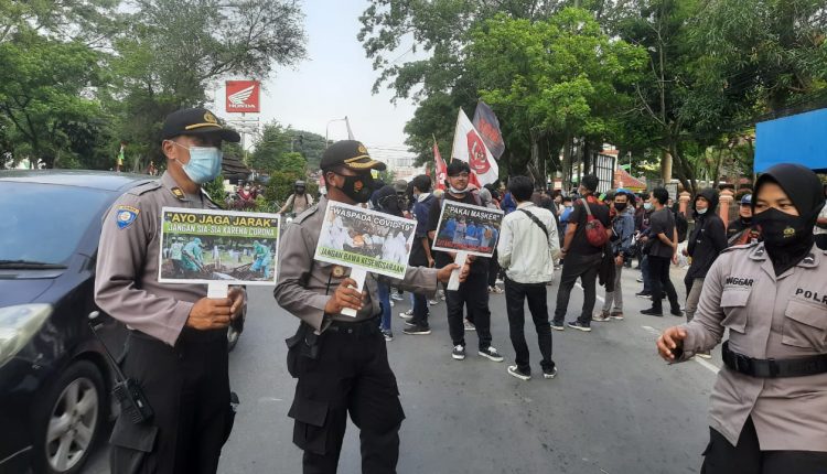 Di Tengah Massa pendemo, Polres Serang Kota Kampanyekan Protokol Kesehatan