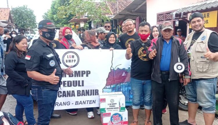CILEGON – Ketua Dewan Pimpinan Cabang (DPC) LSM BMPP Pulo Ampel, Ahmad Sikdi bersama Srikandi DPP LSM BMPP Cilegon-Banten (Pendamping) menyalurkan bantuan kepada korban banjir di Serang.