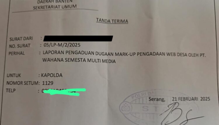 PT Wahana Semesta Multimedia Banten (WSMB) selaku vendor pengadaan website desa kini dilaporkan ke Polda Banten pada Jum’at (21/2/2025), dengan Nomor Laporan Pengaduan 05/LP-M/2/2025.