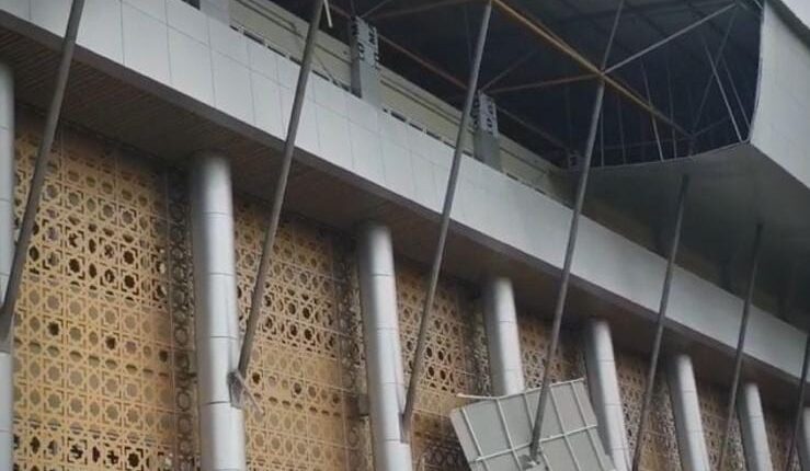 Angin kencang membuat bangunan atas aula itu roboh, hingga membuat orang-orang di sekitar panik.