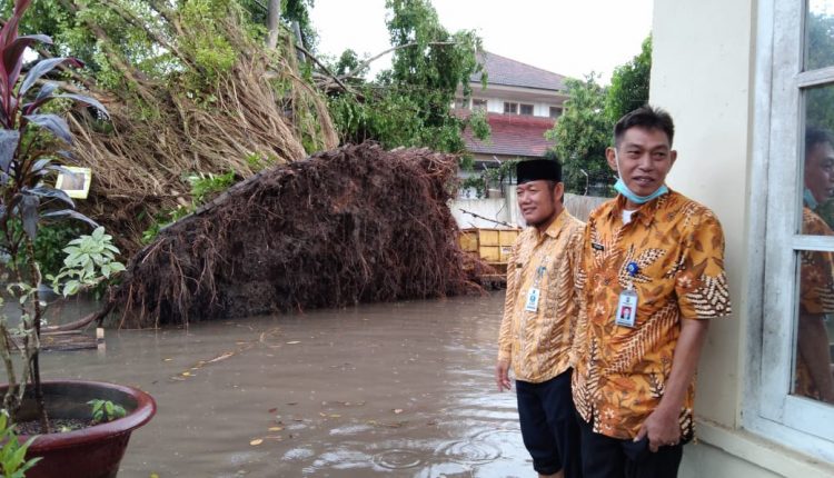 SERANG – Hujan deras disertai angin kencang yang melanda beberapa wilayah di Provinsi Banten pada Kamis, (15/4/2021) kemarin menyebabkan beberapa pohon tumbang, salah satunya pohon besar di samping kantor Dinas Koperasi Perindustrian dan Perdagangan (Diskoperindag) Kabupaten Serang sekitar pukul 14.00 WIB. Selain itu, kantor Diskoperindag pun terendam banjir hingga 30 sentimeter.