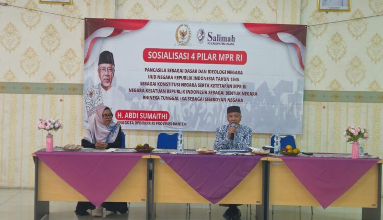 SERANG – Anggota MPR RI, Abdi Sumaithi menghadiri acara sosialisasi 4 Pilar MPR RI di Gedung Catur, Kecamatan Ciruas, Kabupaten Serang, yang dihadiri oleh peserta dari kalangan ibu-ibu, termasuk pengurus Salimah Kabupaten Serang.