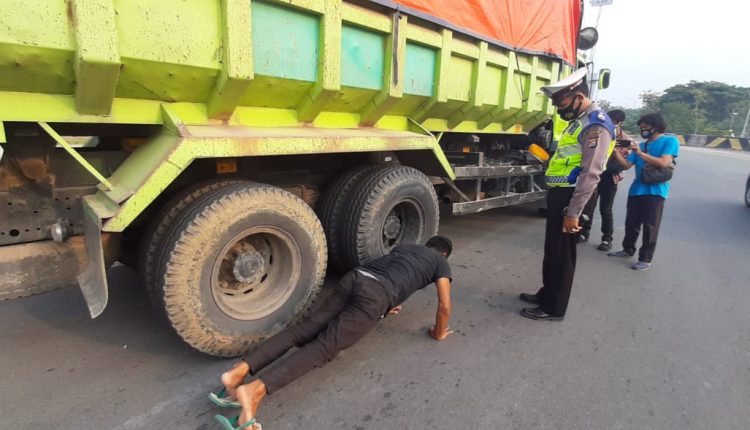 Seorang pengemudi truk terpaksa harus dihentikan petugas karena tidak menggunakan masker. Saat diminta untuk melafalkan pancasila, ia justru lebih memilih untuk di push up.
