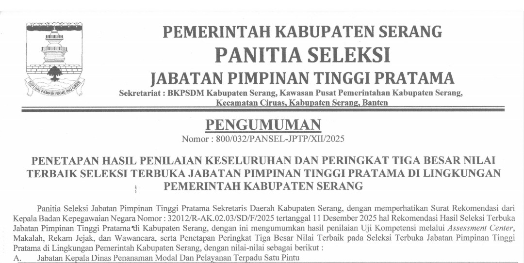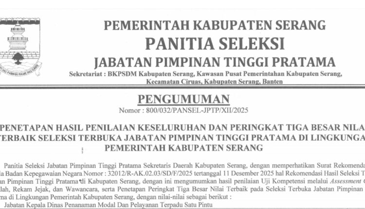 SERANG– Pemerintah Kabupaten (Pemkab) Serang resmi mengumumkan hasil akhir Seleksi Terbuka Jabatan Pimpinan Tinggi (JPT) Pratama Tahun 2025.