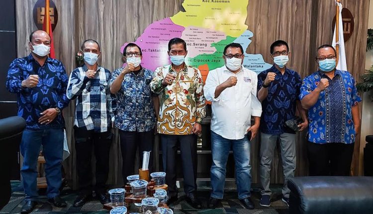 Ketua Umum SMSI Firdaus yang didampingi Ketua Dewan Pakar SMSI yang juga Wakil Ketua Dewan Pers Hendry Ch Bangun, Ketua Departemen Organisasi dan Daerah SMSI Pusat Andi Setiadi sekaligus sebagai Koordinator Bhakti Sosial Pembangunan Jalan Panitia HPN 2021, Humas SMSI Pusat Izaac M Tulalessy, Ketua SMSI Provinsi Banten Lesman Bangun dan Ketua Bidang Organisasi SMSI Provinsi Banten Sahatma Refindo menemui Walikota Serang Syafrudin di ruang kerjanya, Jumat (22/1/2021).