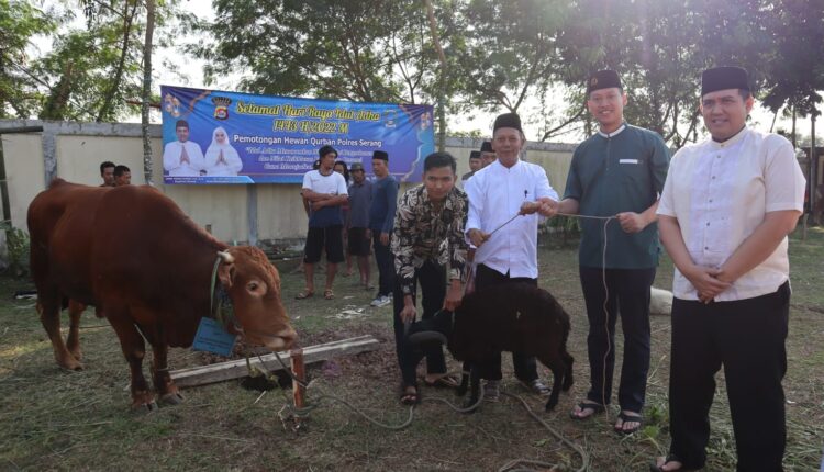 SERANG – Jajaran Polres Serang Polda Banten melaksanakan kegiatan pemotongan hewan kurban di lapangan hitam Mapolres Serang, pada minggu (10/7/2022).