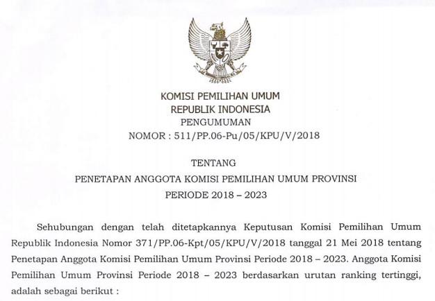 Surat tersebut tentang penetapan Anggota Komisi Pemilihan Umum Provinsi periode 2018-2023.