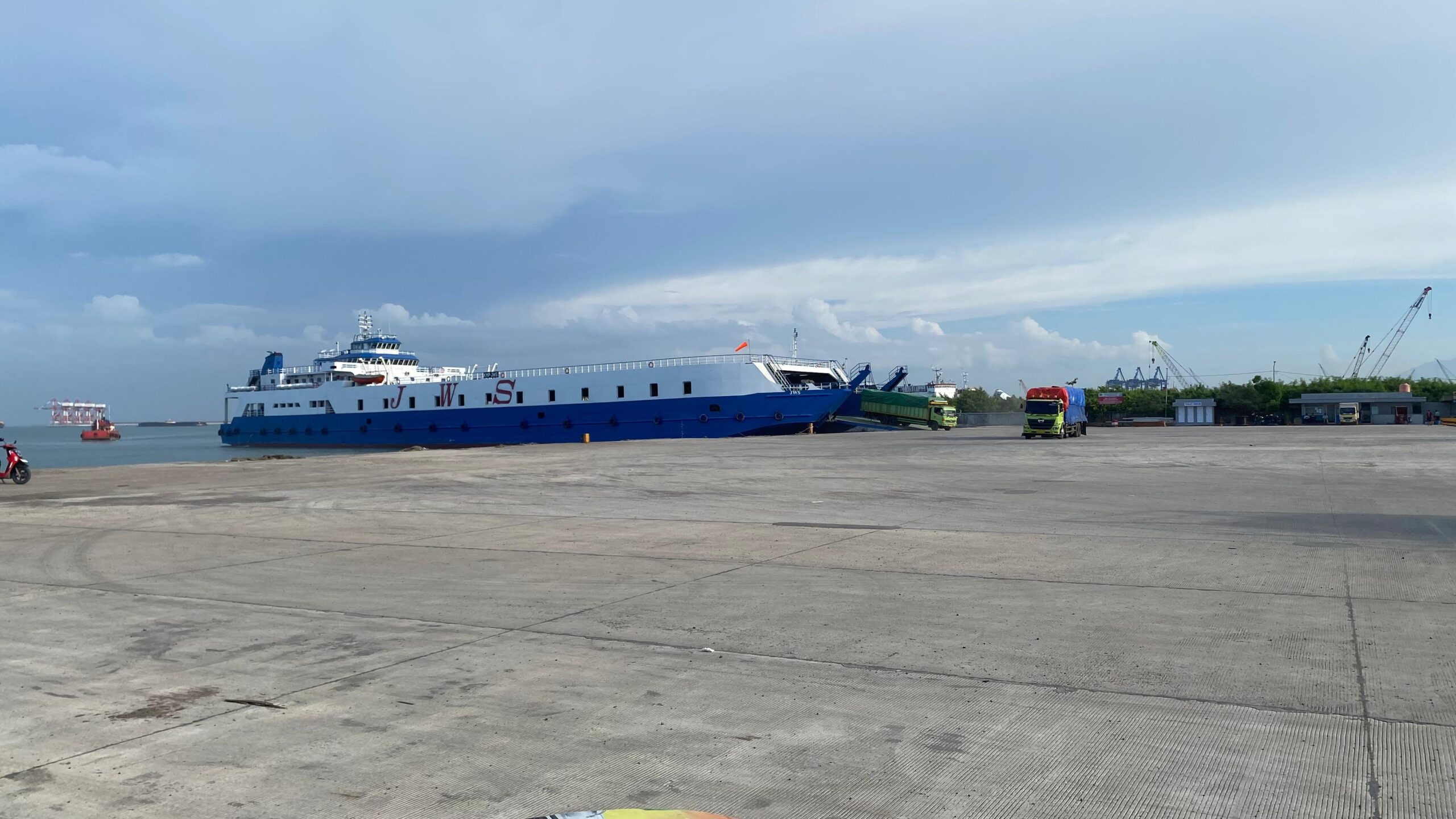 Salah satunya adalah kapal berukuran besar yang mampu mengangkut hingga 70 unit truk dalam satu kali perjalanan.