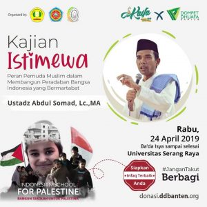 Acara akan digelar selepas isya, pada Rabu 24 April 2019 mendatang. Selain tabligh akbar, LDK Karisma Unsera dan Dompet Dhuafa Banten juga menggalang dana untuk pembangunan sekolah di Al-Amood, 700 meter dari Masjidil Aqsa di Palestina.