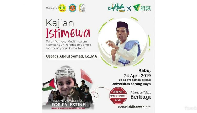 SERANG – Dalam rangka syiar Islam yang masih terangkai dalam momen hangatnya Isra Mi’raj serta pemanasan untuk memantapkan hati dalam beribadah menghadapi bulan Ramadhan, Lembaga Dakwah Kampus (LDK) Karisma Universitas Serang Raya (Unsera) bekerjasama dengan Dompet Dhuafa Banten menghadirkan penceramah kondang Ustadz Abdul Somad atau yang akrab disapa UAS di Serang dalam tabligh akbar bertema peran pemuda muslim dalam rangka membangun peradaban bangsa Indonesia yang bermartabat.