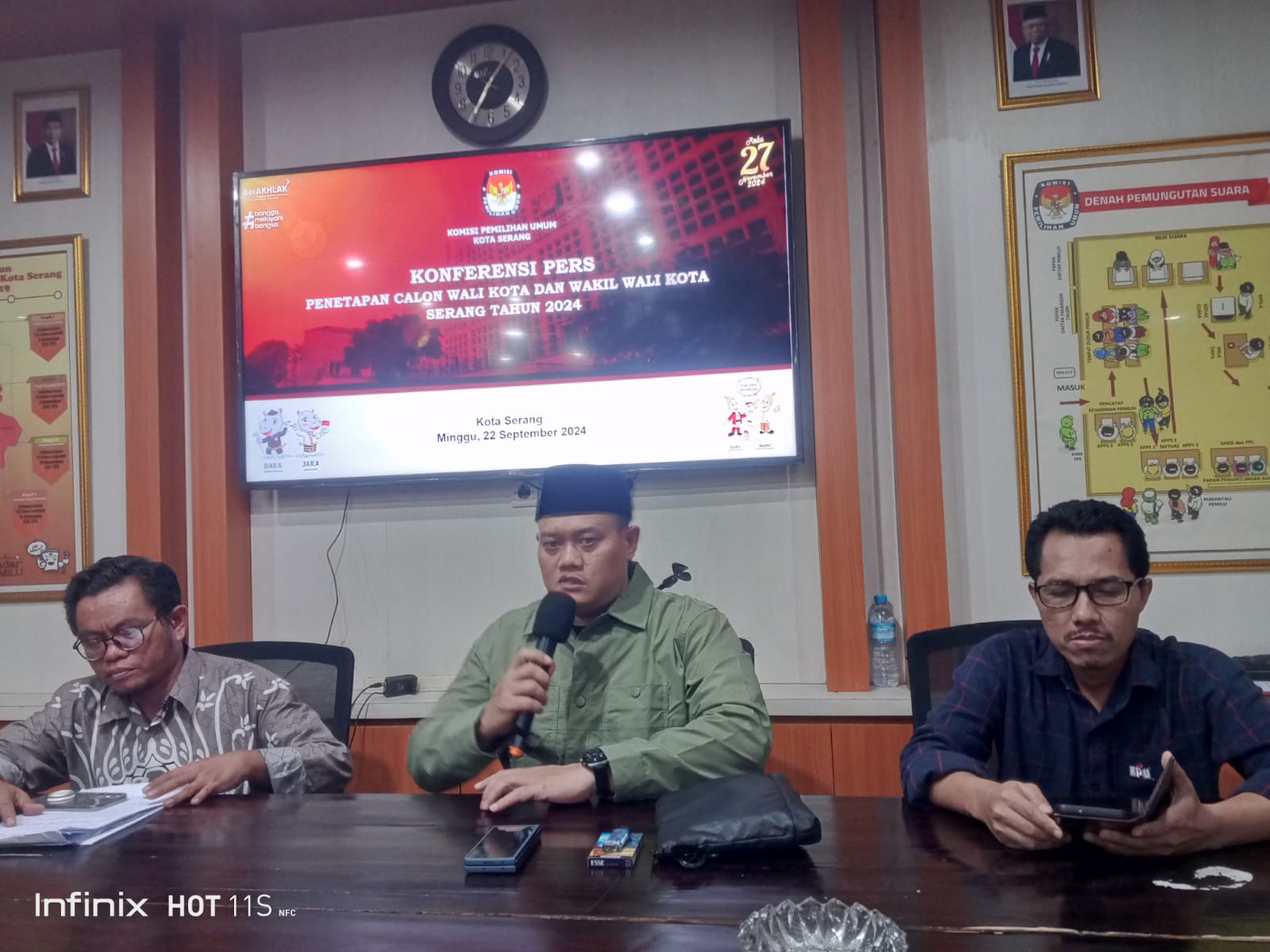 “Penetapan paslon kami sudah melakukan pleno atas dasar tahapan dan juga di PKPU pencalonan, dilakukan Plano tertutup tadi pada pukul 09.30 kami melakukan pleno dihadiri oleh 5 komisioner KPU dan pihak sekretariat KPU Kota Serang,” ucap IIP saat konferensi pers, Minggu (22/9/2024).