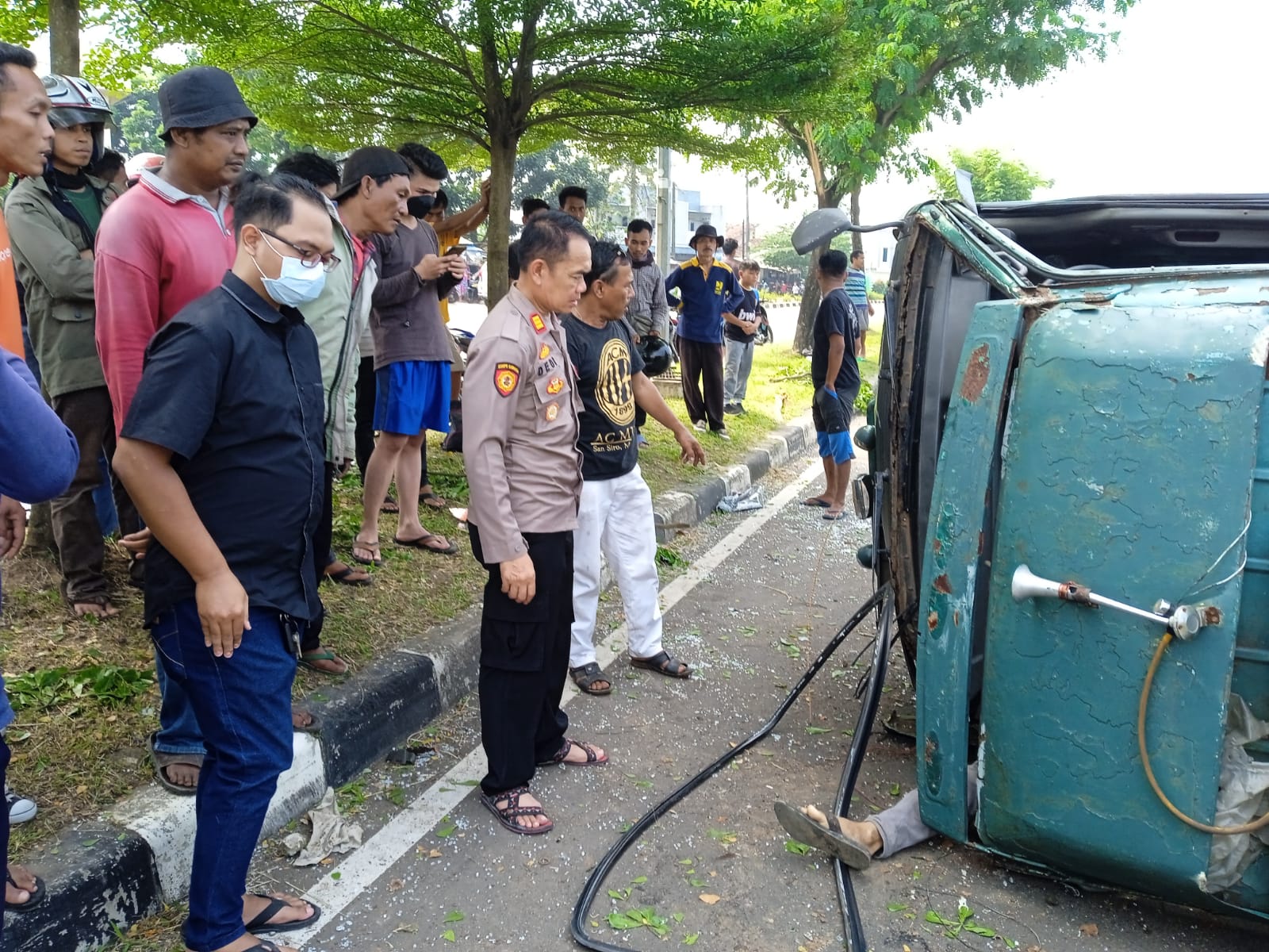 “Meninggal 2 orang, 1 penumpang elf yang duduk di depan sebelah kiri samping supir, diduga karena benturan keras di kepala dan bagian kaki terjepit badan mobil yang terbalik, dan 1 lagi itu pengendara sepeda motor, ibu-ibu tapi belum diketahui identitasnya,” imbuhnya.