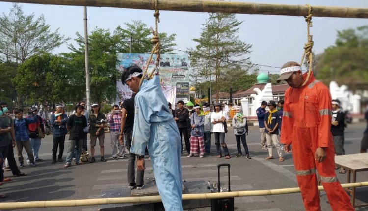 SERANG – Puluhan aktivis lingkungan dan Mahasiswa Pecinta Alam (Mapala) se-Banten menggelar aksi teatrikal di depan Pendopo Bupati Serang. Pihaknya meminta agar Pemerintah Kabupaten Serang segera menyelesaikan persoalan lingkungan, Senin (23/9/2019).