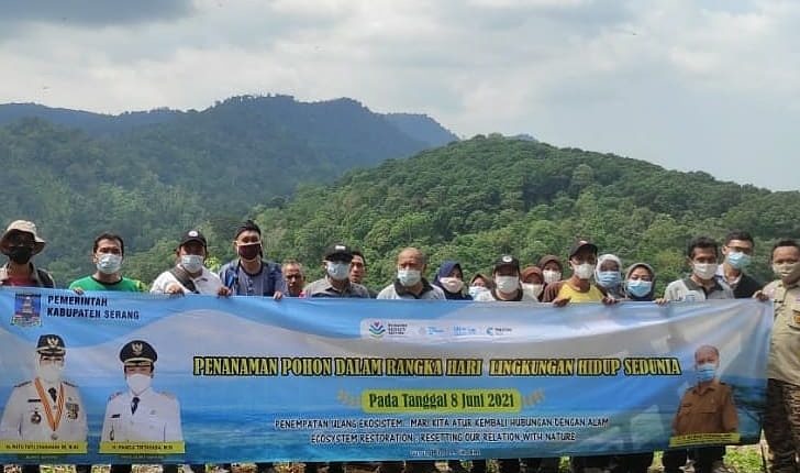SERANG – Dalam rangka memperingati hari Lingkungan Hidup Sedunia yang jatuh pada 5 Juni, Dinas Lingkungan Hidup Kabupaten Serang, melakukan penanaman pohon di Puncak Gunung Pilar Kampung Cibunut, Desa Cikolelet, Kecamatan Cinangka, Kabupaten Serang, Banten, Selasa (08/06/2021).