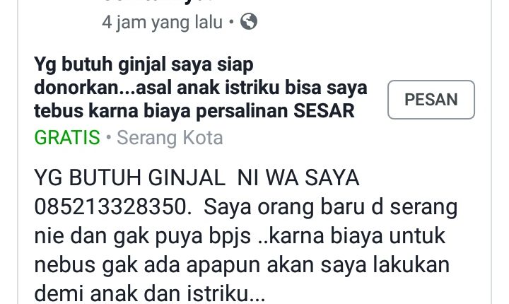 SERANG – Salah seorang kepala keluarga di Kota Serang dengan nama akun Medsos Facebook “Yusuf Kujang” mendadak viral dengan memposting hendak menjual ginjal untuk melunasi biaya persalinan istrinya di RS Fatimah.