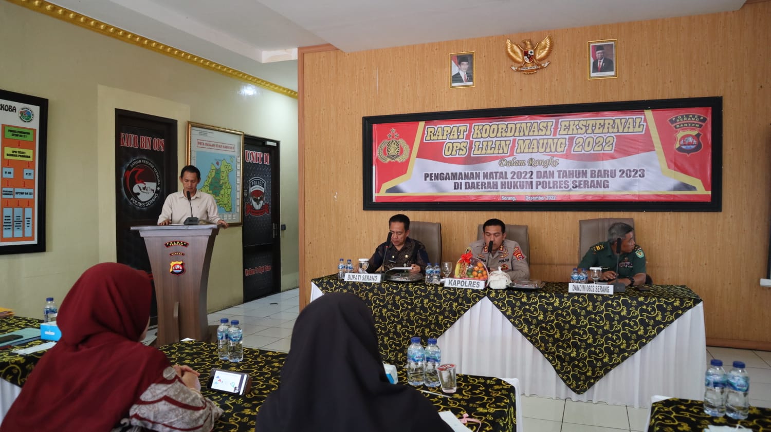 SERANG – Menjelang perayaan Natal 2022 dan Tahun Baru 2023, Polres Serang melaksanakan rapat kordinasi (Rakor) eksternal Operasi Lilin Maung 2023 di gedung Satresnarkoba Mapolres Serang, Kamis (15/12/2022).
