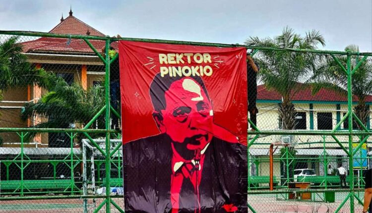 SERANG – Spanduk dengan gambar Rektor Untirta Fatah Sulaiman dengan bertuliskan ‘Rektor Pinokio’ terpajang di tiga kampus Untirta.